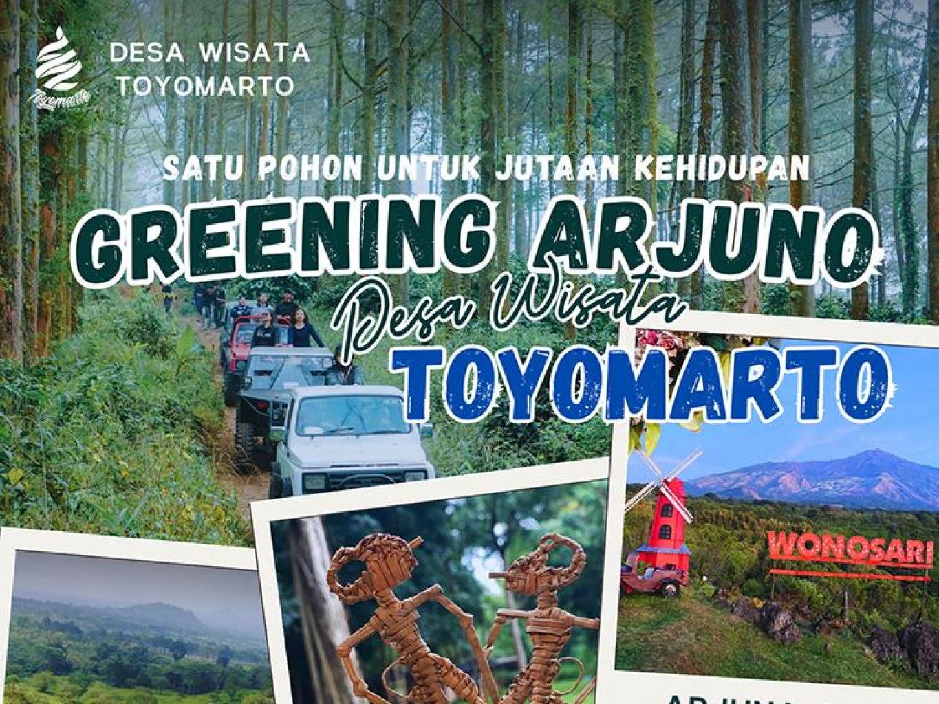 Poster ini mempromosikan paket wisata bertema lingkungan di Desa Wisata Toyomarto dengan kegiatan utama penghijauan (Greening Arjuno).