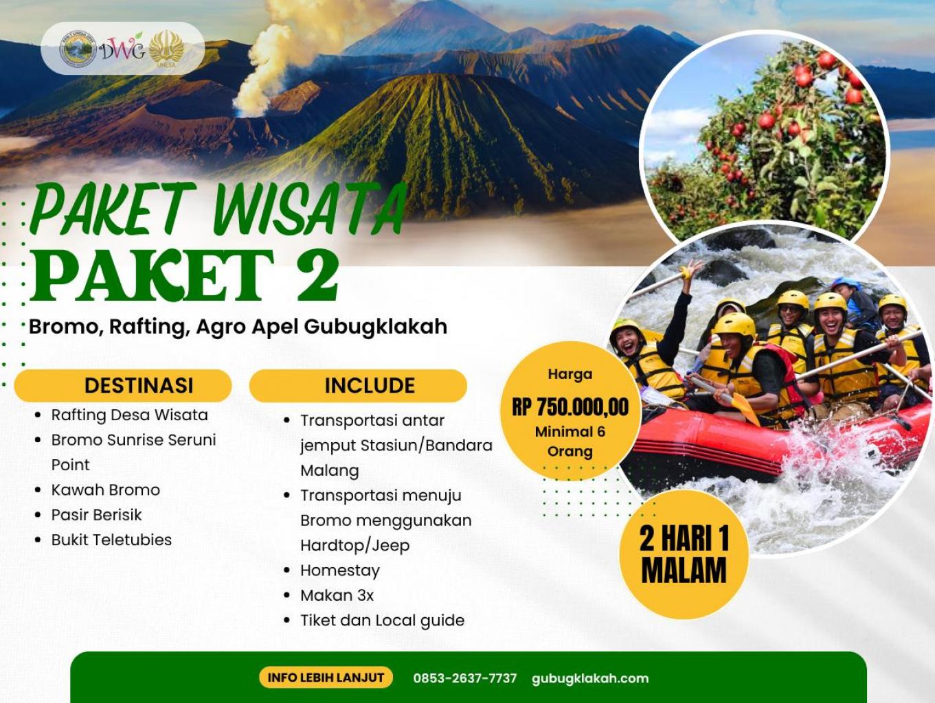 Paket Wisata 2 Desa Gubugklakah menghadirkan pengalaman petualangan seru selama 2 hari 1 malam. Wisatawan akan menikmati rafting di sungai desa, menyaksikan keindahan sunrise di Bromo, menjelajahi Kawah Bromo, Pasir Berisik, dan Bukit Teletubbies, serta berwisata agro petik apel khas Gubugklakah. Paket ini dilengkapi fasilitas lengkap seperti transportasi antar-jemput, jeep menuju Bromo, homestay nyaman, makan 3 kali, tiket wisata, dan pemandu lokal berpengalaman. Cocok untuk rombongan minimal 6 orang dengan harga terjangkau.